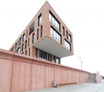 Der in orangenem Ziegelmauerwerk gefasste Baukörper besteht aus zwei winkelförmig angeordneten Flügeln. Im Straßenflügel befindet sich das nischenförmig ausgebildete repräsentative Entree. Der Seitenflügel kragt spektakulär ab dem zweiten Obergeschoss über die dort verlaufende Uferpromenade aus. An der Wasserseite befindet sich über der Tiefgarage ein mit Pflanzinseln gestaltetes Atrium.