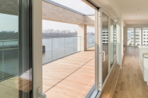 Die Staffelgeschosse springen nur minimal zurück, was die klaren kubischen Umrisse der Baukörper unterstreicht. Die Einschnitte der großen Terrassen werden hier durch die Mauerbänder pergolenartig gerahmt. In den anderen Obergeschossen sind die Freiflächen halb Loggien, halb Balkone. Ihre gläsernen Brüstungen unterstreichen die Klarheit des Gesamtgefüges. Eine leichte Schrägstellung der Balkone fällt kaum ins Auge.