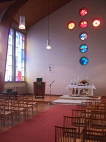 Da das Grundstück, das zur Verfügung stand, knapp bemessen war, entstand eine sehr kompakte Bauanlage, in der der Sakralbereich optisch kaum hervorgehoben ist. Kirche und Gemeindesaal liegen in einer Flucht und lassen sich durch das Öffnen einer Faltwand vereinen. Der nüchtern gehaltene Sakralraum ist mit losem Binsengeflecht- Gestühl ausgestattet. Die hölzernen Dachbinder sind ebenso sichtbar wie das Ziegelmauerwerk, das innen weiß gestrichen ist. Eine große Fensterwand an der Nordseite sorgt für eine gleichmäßig gute Belichtung.