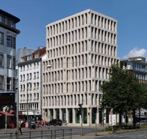 „Das innerstädtische Büro- und Geschäftshaus überzeugt trotz großer Höhe mit einer skulpturalen Eckausbildung, die in die Nachbarbebauung hinein vermittelt. So entsteht trotz der rigiden Fassadengestaltung ein lebhaftes Spiel der Formen unter dem Licht. Der skulpturale Ansatz wird durch die Tiefe der Fensterleibungen und die Reduzierung der Materialien auf Glas und Steinbeton.“