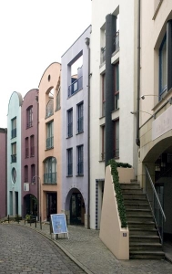 _Die 27 Häuser enthalten unten Läden oder Büros, teils eng verknüpft mit der unteren Wohnung, die sich im ersten Oberschoss fortsetzt. Darüber liegt eine weitere zweigeschossige Wohnung mit einem separaten Zugang, der teilweise über eine Außentreppe erfolgt.