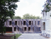Ein gläserner Gang verbindet den langgestreckten zweigeschossigen Neubau mit dem Altbau. An einen Flur ordnen sich rechts und links Einzelzimmer an. Raumhohe naturbelassene Fenster verleihen diesen eine gewisse Großzügigkeit und lenken den Blick in den grünen Außenraum. Der mit Faserzementtafeln in zwei Grautönen verkleidete Neubau tritt optisch bewusst hinter die weiß gestrichene historische Villa zurück. Durch die unregelmäßige Anordnung der Fenster sowie durch die Farbnuancierung der Tafeln wird eine Monotonie vermeidende Rhythmisierung der Fassade erzielt.