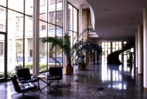 Den architektonischen Höhepunkt der Anlage bildet die großzügige Eingangshalle des um einen Lichthof herum angelegten Verwaltungsbaus. Sie öffnet sich zur gläsernen Hoffront über zwei Geschosse. Einen typischen raumcharakter der fünfziger Jahre erhält die Hall dadruch, dass der Flur im Obergeschoss entlang einer organischen Kurve verläuft - einer Bewegung, die mit der freitragenden Haupttreppe noch verstärkt wird.